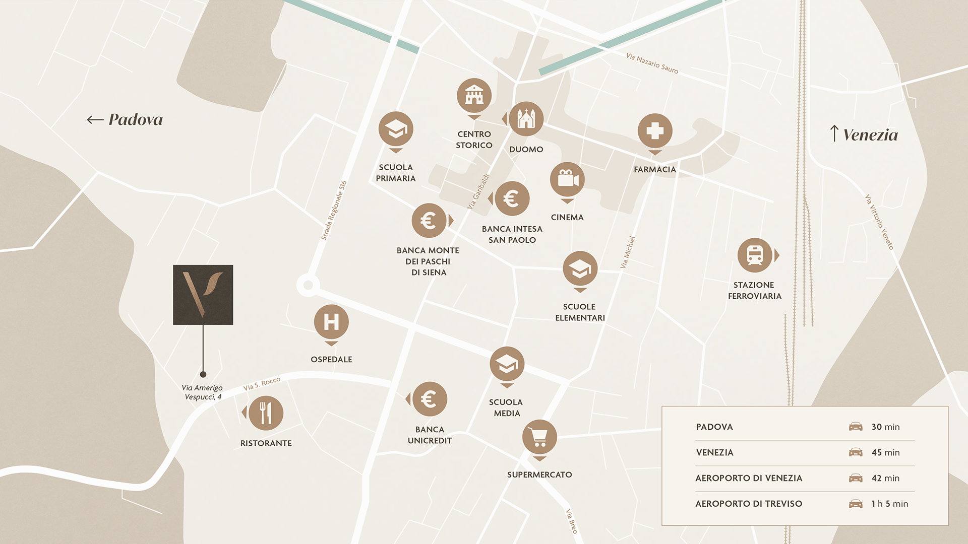 Qui tutto è pensato per rendere facile la routine: Vireya è situato un quartiere residenziale, ben collegato e completo di servizi. La vicinanza a Padova e Venezia amplia le possibilità, mentre la presenza della Laguna aggiunge luce e respiro, lontano dal rumore.